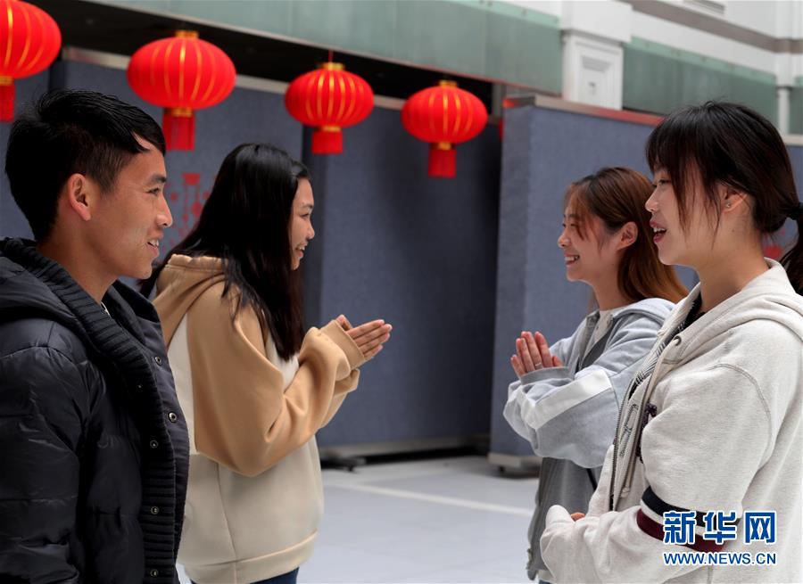 3月28日,老挝留学生在食堂遇到了认识的中国学生。双方用老挝人的习惯手势打招呼。 新华社记者 刘颖 摄